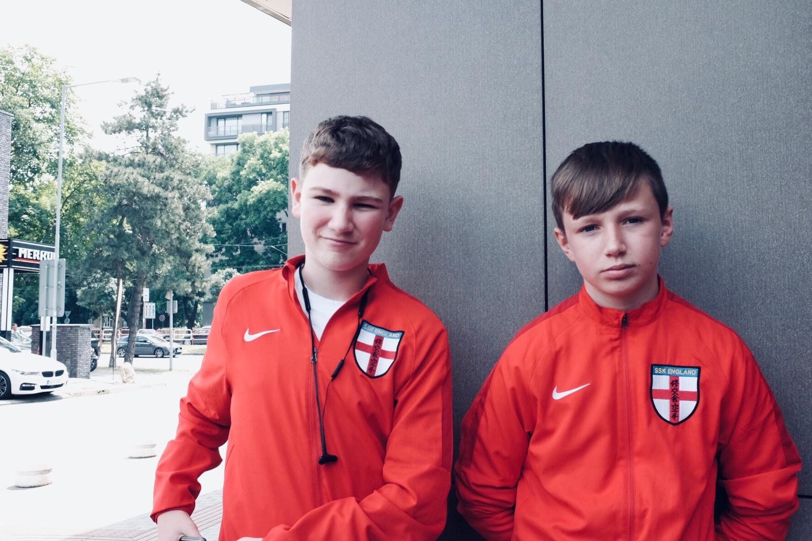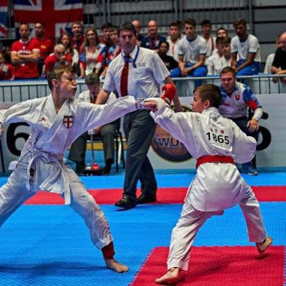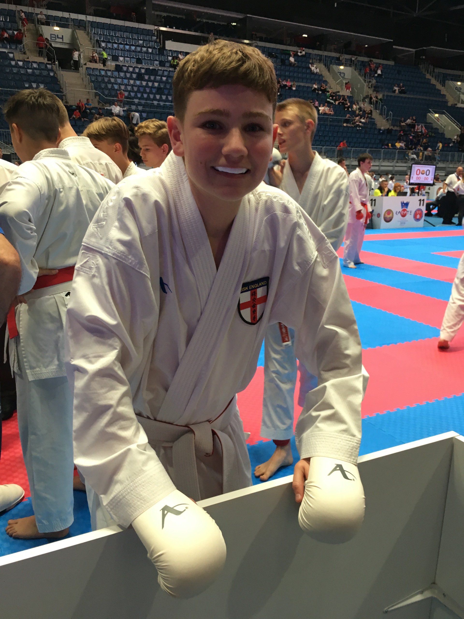 A very long day! Max, Joel and Stevie took to the mats early on in team kumite. Winning their first fight against Slovakia convincingly, the boys showed great grit and determination. Unfortunately, in the next round the boys lost out to a talented Slovenian team who eventually made the final. Just missing out on the medal rounds.